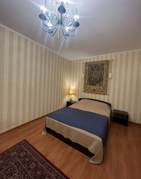 В комнате, 19 кв м, двуспальная кровать, прикроватные тумбочки, диван раскладной, журнальный столик, тумба под телевизор, телевизор.