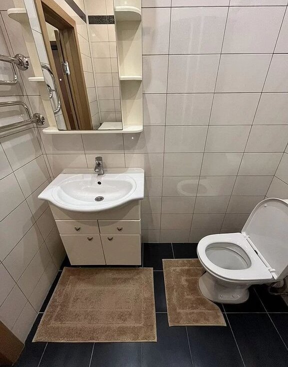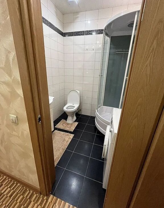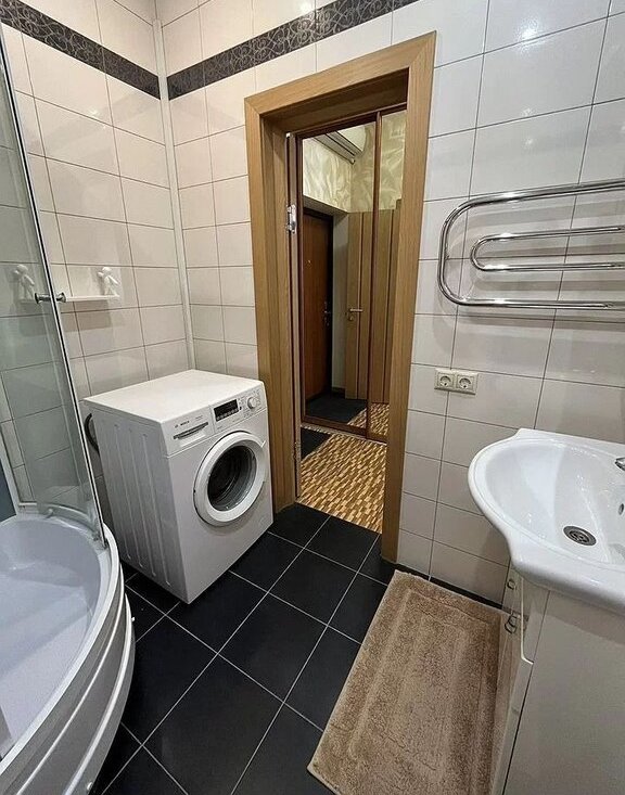 Санузел совмещённый, оформлен в современном стиле. В наличии вся необходимая сантехника и стиральная машина.