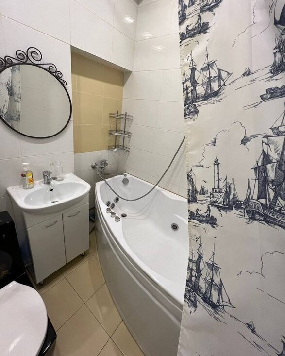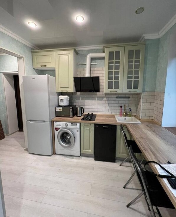 Во дворе - парковка со шлагбаумом б в квартире есть все необходимое из техники и мебели (новая кухня, диван, большой шкаф, телевизор, пылесос, микроволновка, новый холодильник, посудомоечная машина, чайник, стиральная машина на 6 кг, ванна с джакузи + душ, мультиварка, кондиционер, гладильная доска, сушилка).