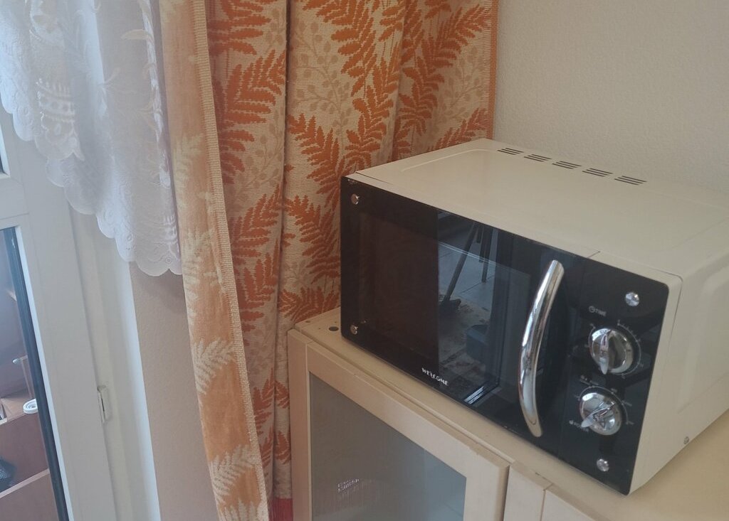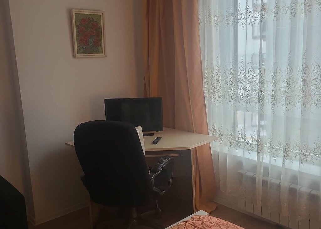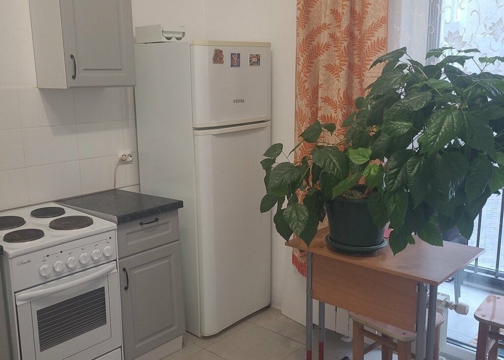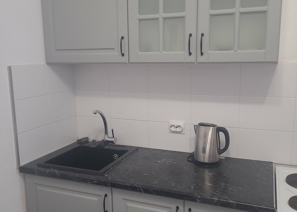 В квартире выполнен евро ремонт. Просторная комната оборудована шкафами и диваном. Из мебели также имеется удобный письменный стол и стул. В кухне установлена современная бытовая техника: холодильник, плита, микроволновая печь и стиральная машина.