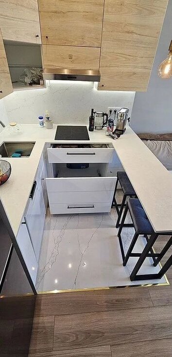 - Полный комплект встроенной техники: варочная панель, вытяжка, посудомоечная машина