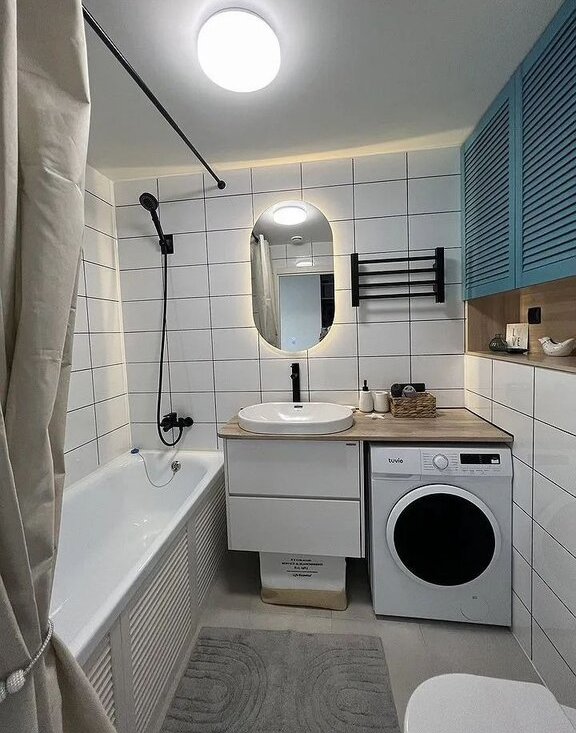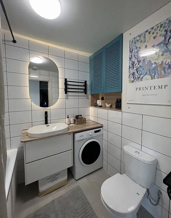 Ванная комната оборудована зеркалом с подсветкой, полотенцесушителем, удобной раковиной, корзиной для белья и местами для хранения. Стиральная машина в наличии.