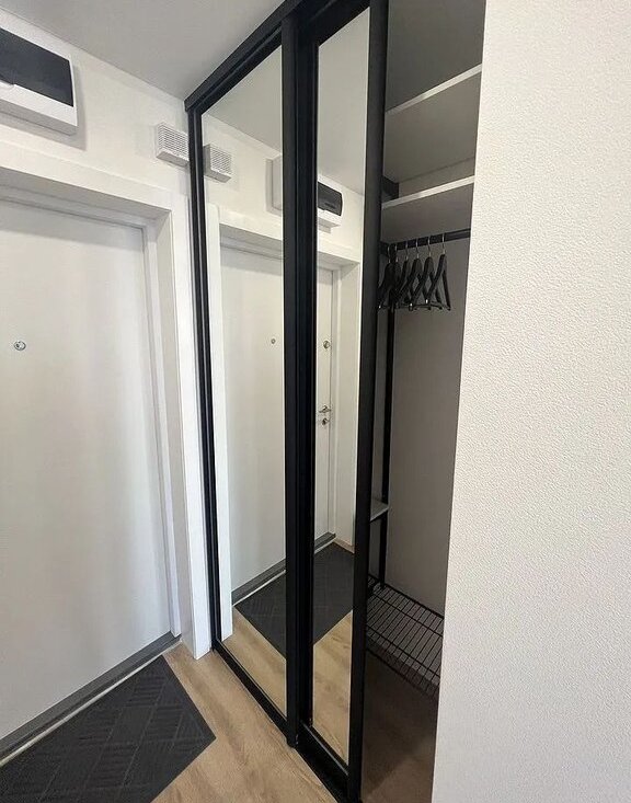 Прихожая с просторной нишей для хранения вещей с зеркальными раздвижными дверями.