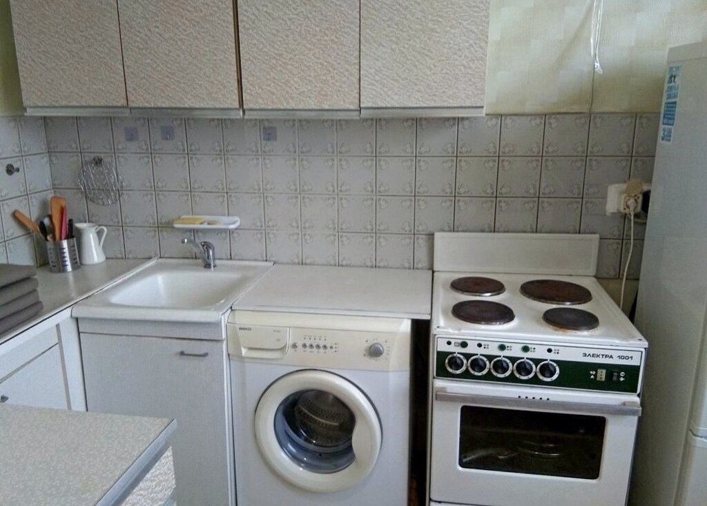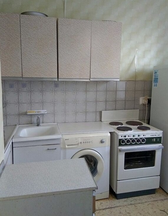 - кухня с фартуком из керамической плитки, электроплита, холодильник, кухонный гарнитур, стиральная машина, двухспальный диван