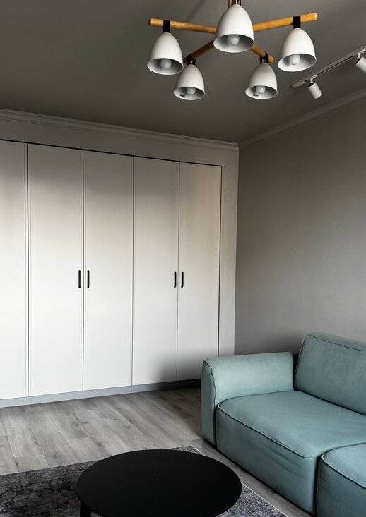 Просторная гостиная с большим и вместительным встроенным шкафом