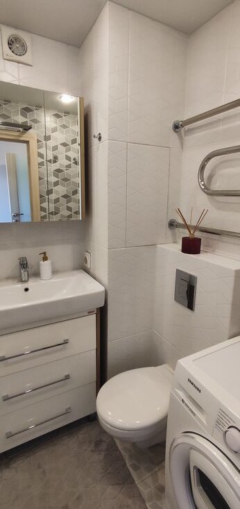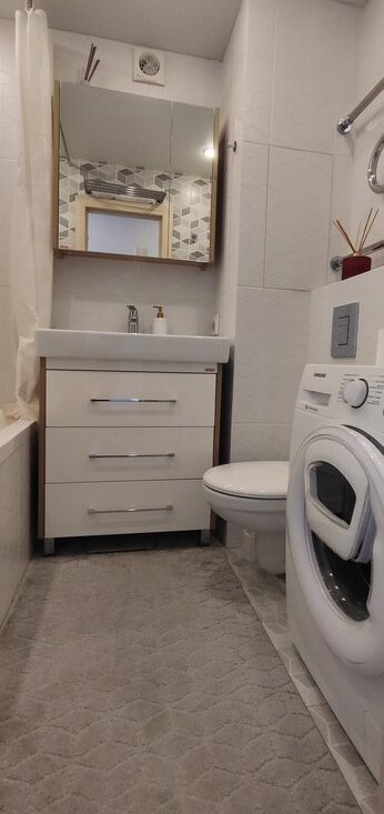 Ванная комната совмещенная, оборудована современной сантехникой и стиральной машиной. В комнате установлены шкафы для хранения вещей.