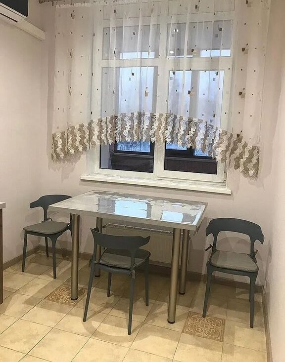 Большaя комнатa – дивaн, телeвизoр, кофeйный стол cо cтульями.