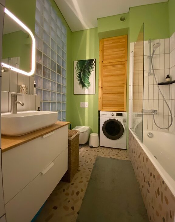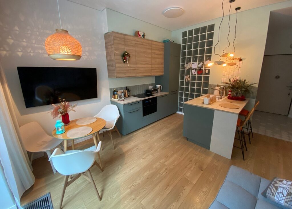 Есть необходимая бытовая техника (холодильник, варочная, микроволновка, духовка, ПММ и стиральная машина, вытяжка), водонагреватель, система фильтрации воды, мягкая мебель, большая 2х спальная кровать, система хранения.