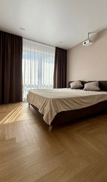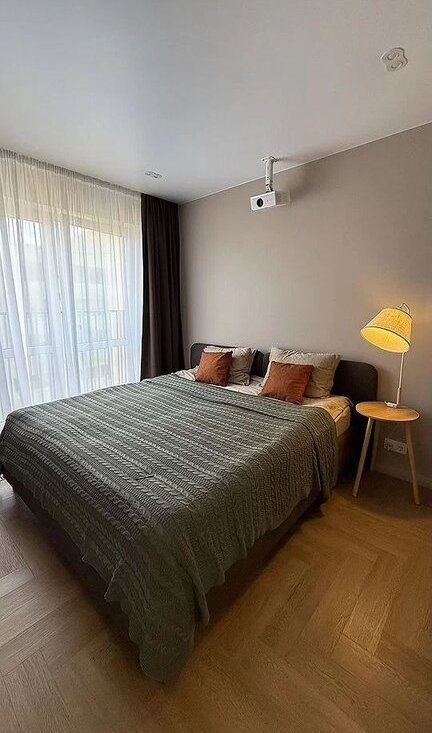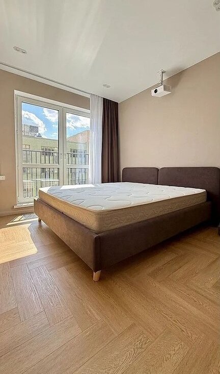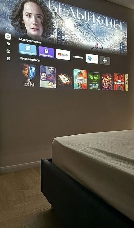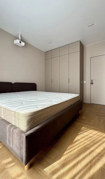 В спальне можно смотреть фильмы на большом экране благодаря современному проектору. Кровать с ортопедическим матрасом 180х200 см