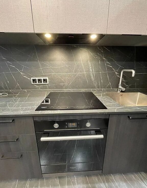 Встроенная индукционная плита, духовой шкаф, стиральная машина, холодильник.