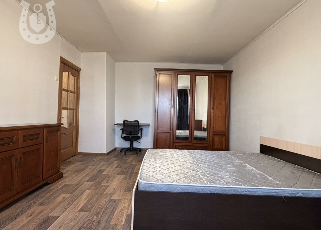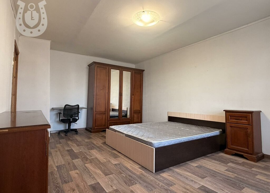 В спальне двуспальная кровать 160*200, вместительный шкаф, комод, рабочий стол, а также кондиционер.