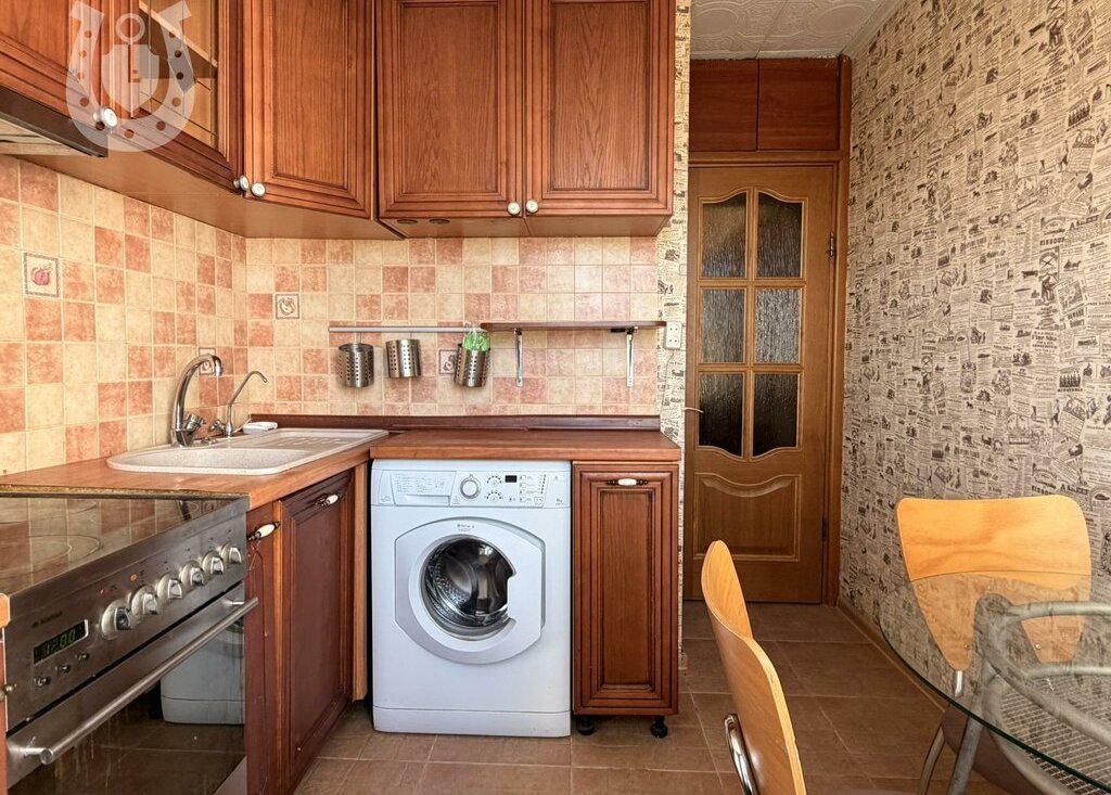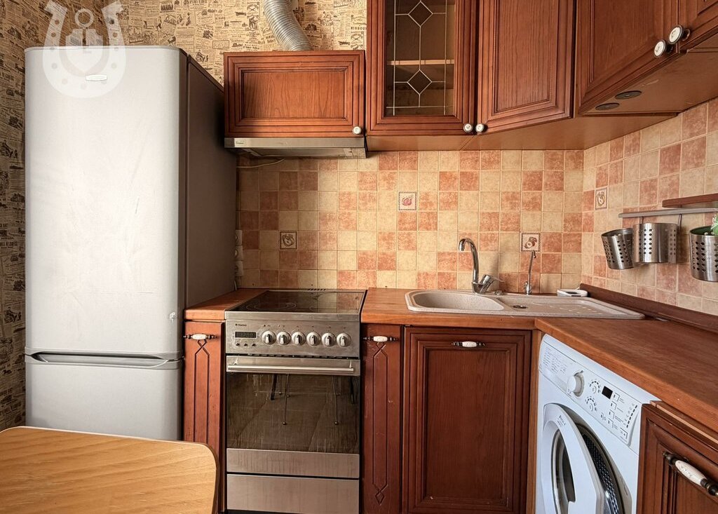 На кухне установлен холодильник, плита с духовым шкафом, стиральная машина.