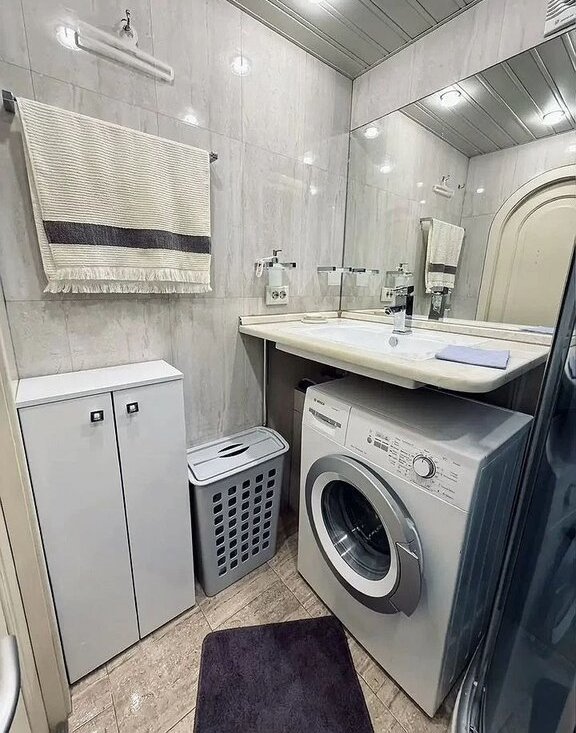 Ванная комната: чистая, светлая, с полной комплектацией (стиральная машина, раковина, зеркало, шкафчик, корзина для белья, полотенца и коврик).