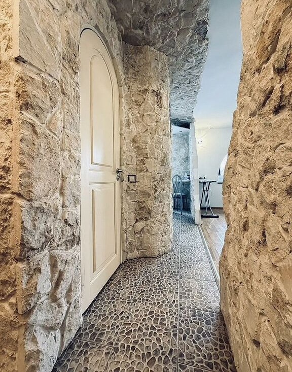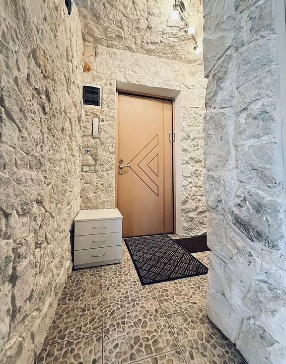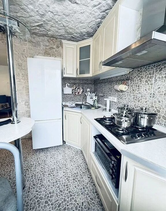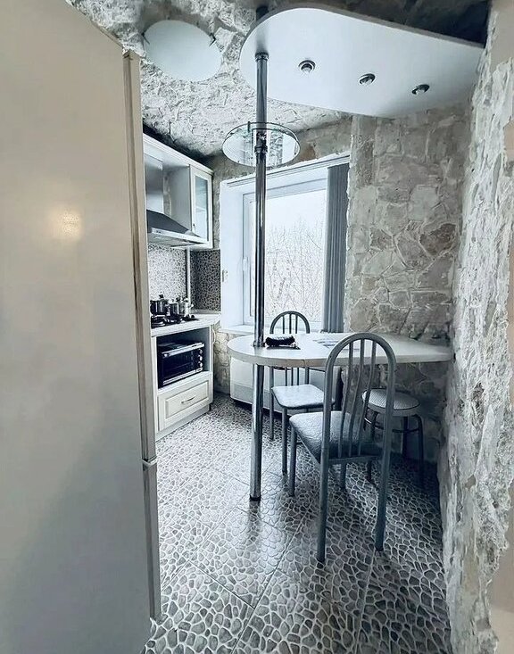 Дизайн кухни: отделка «под камень» придаёт особый шарм — смотрится стильно и практично. Пол, фартук и потолок выполнены в едином стиле, создающем ощущение гармонии.