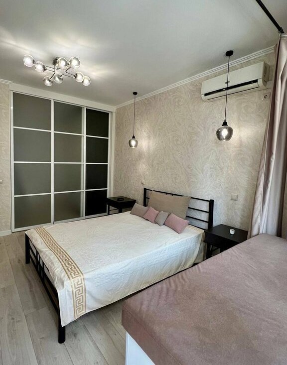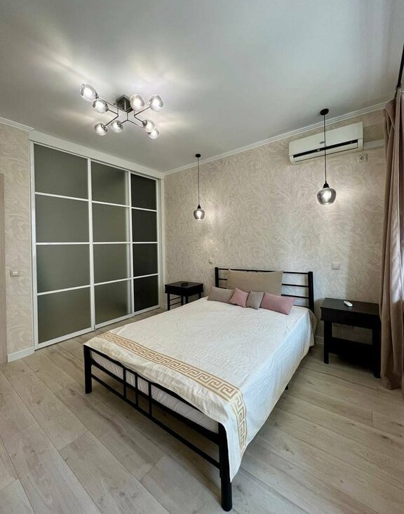 Квартира полностью меблирована: удобная кровать, системы хранения, обеденная зона, всё продумано для комфортного проживания.