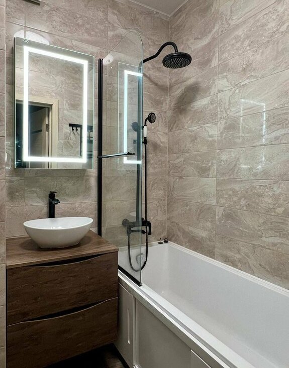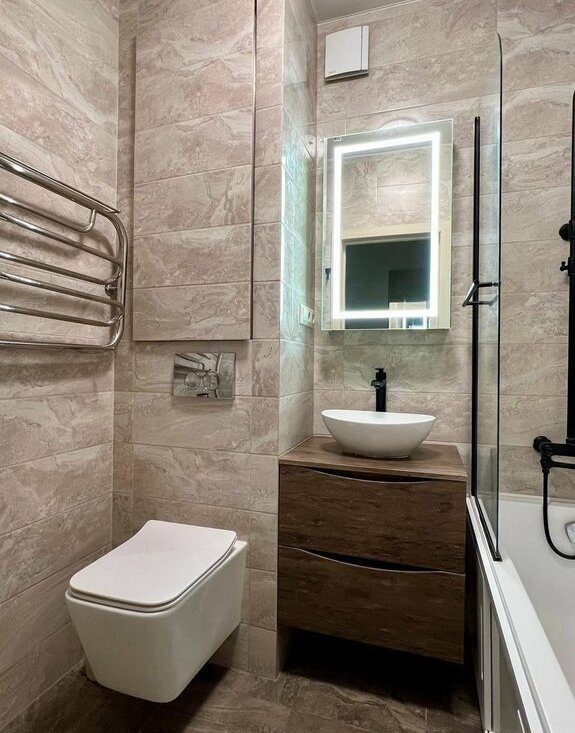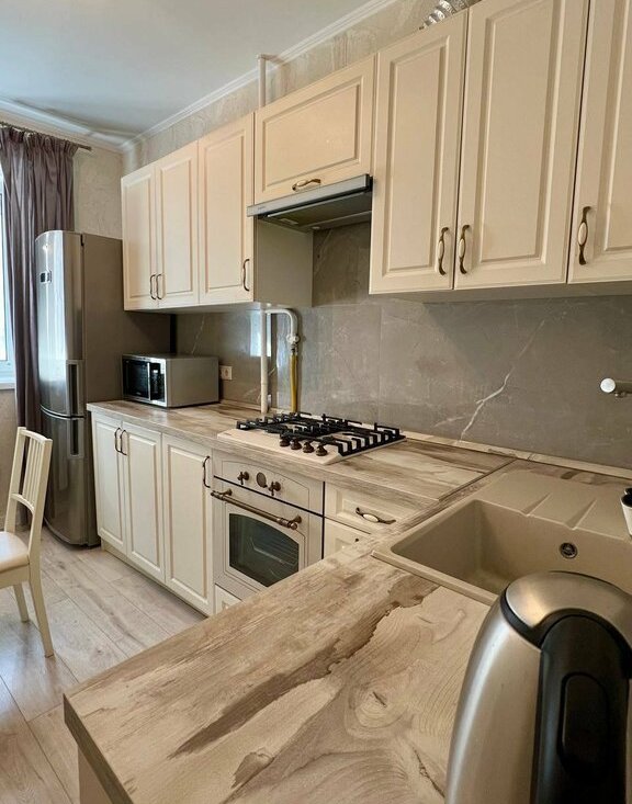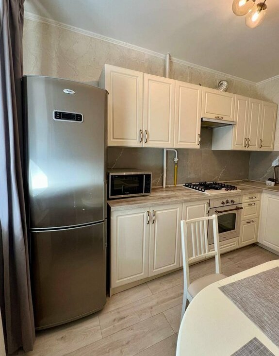 Установлена новая бытовая техника: стиральная и сушильная машины, посудомоечная машина, водонагреватель, варочная панель, духовка, холодильник, мелкая техника по необходимости. Санузел с качественной сантехникой.