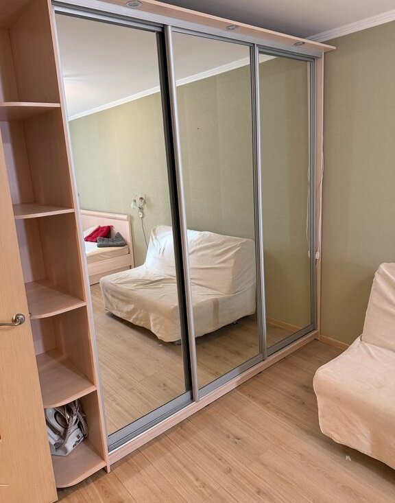 В комнате шкаф- купе, диван, новая двуспальная кровать.