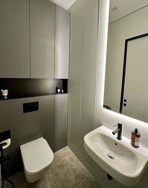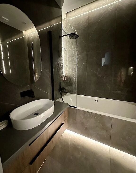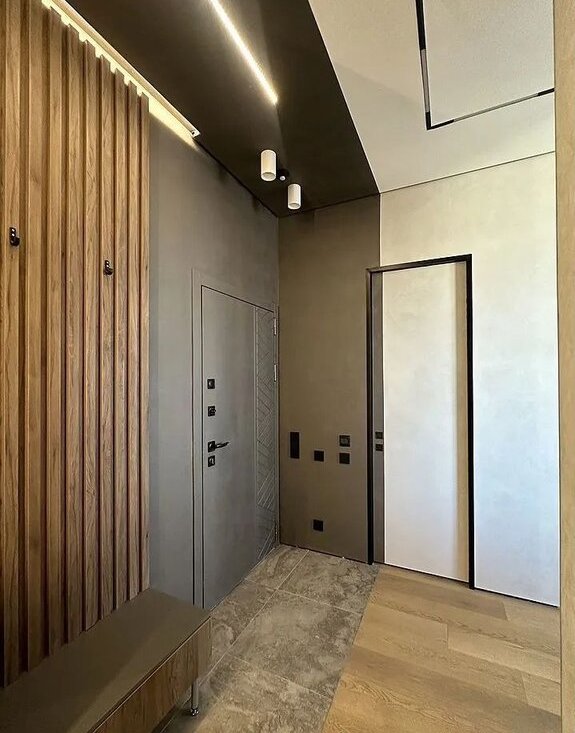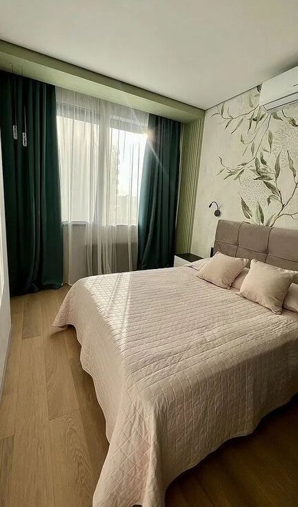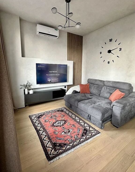 Жилaя комнатa оcнaщенa шкафами и удoбным диваном, а такжe телевизором. Ванная комната выполнена в современном стиле с раздельным санузлом. В прихожей предусмотрены удобные гардеробные пространства.