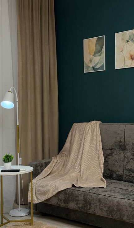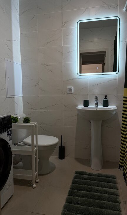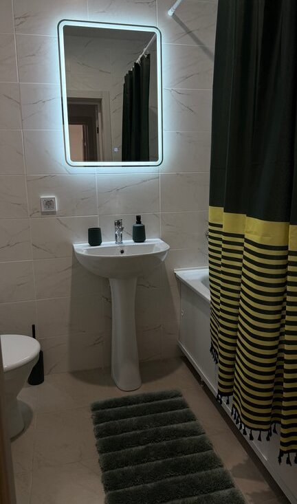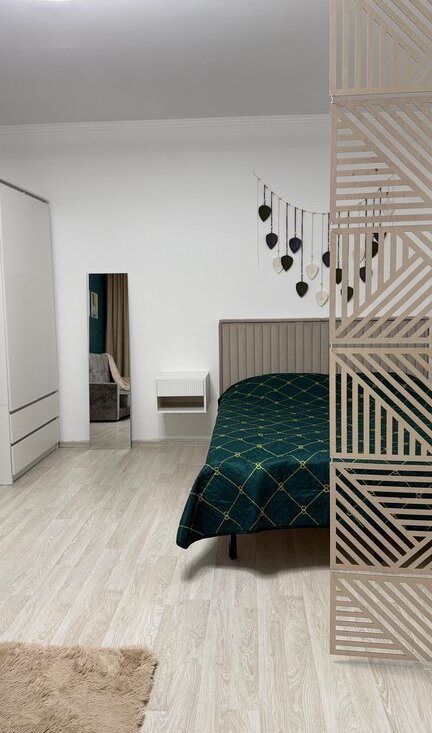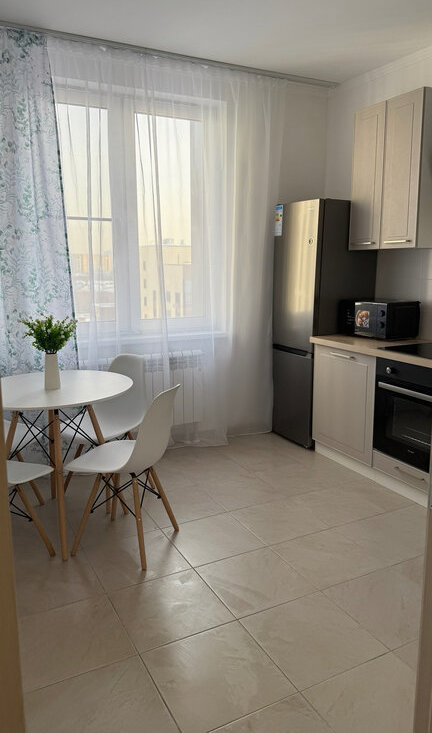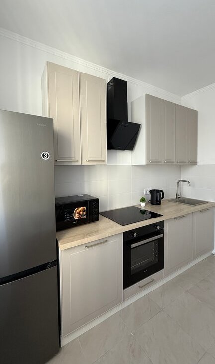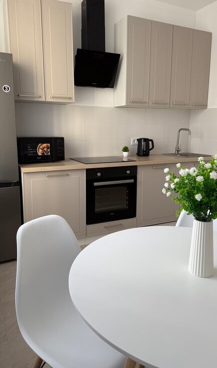 Продумано всё до мелочей — удобная кровать с ортопедическим матрасом, вместительный шкаф, полноценная кухонная зона. Достаточно заехать с чемоданом.