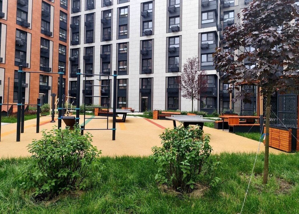 ЖК очень камерный, двор хорошо обустроен. Есть шезлонги, беседки, детская площадка и спортивные тренажеры. Есть теннисные столы. В здании есть коворкинг.
