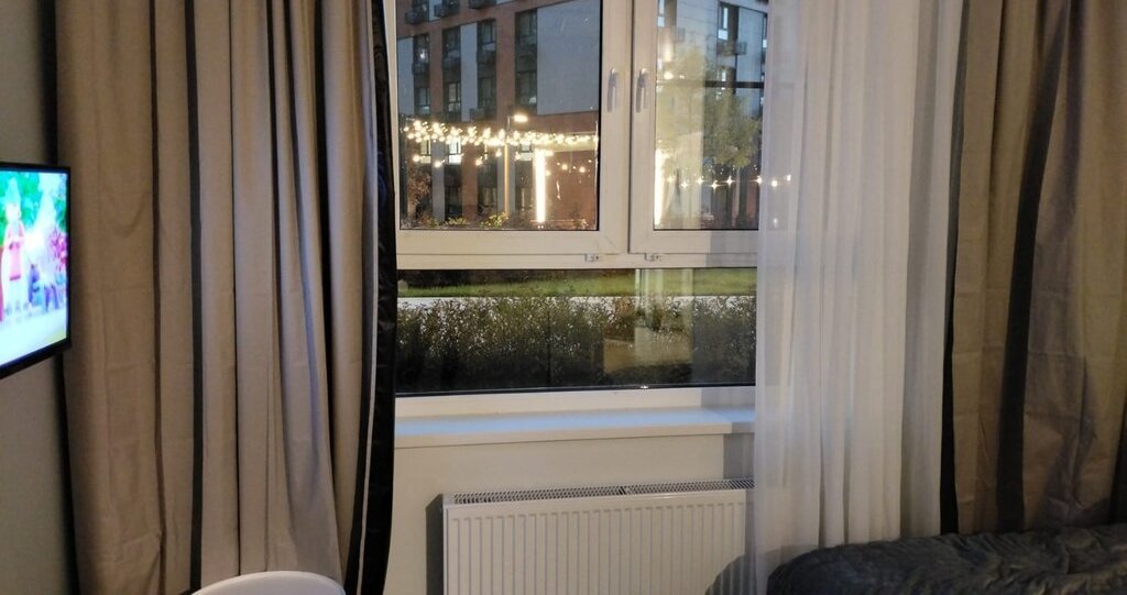 Продается уютная светлая студия с хорошим видом на вечернее освещение двора.