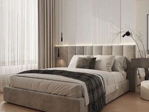 Спальня: вместительный шкаф-купе, туалетный столик с зеркалом, комод, телевизор 55 дюймов, двуспальная кровать с подъемным механизмом, прикроватные тумбочки, кондиционер.
