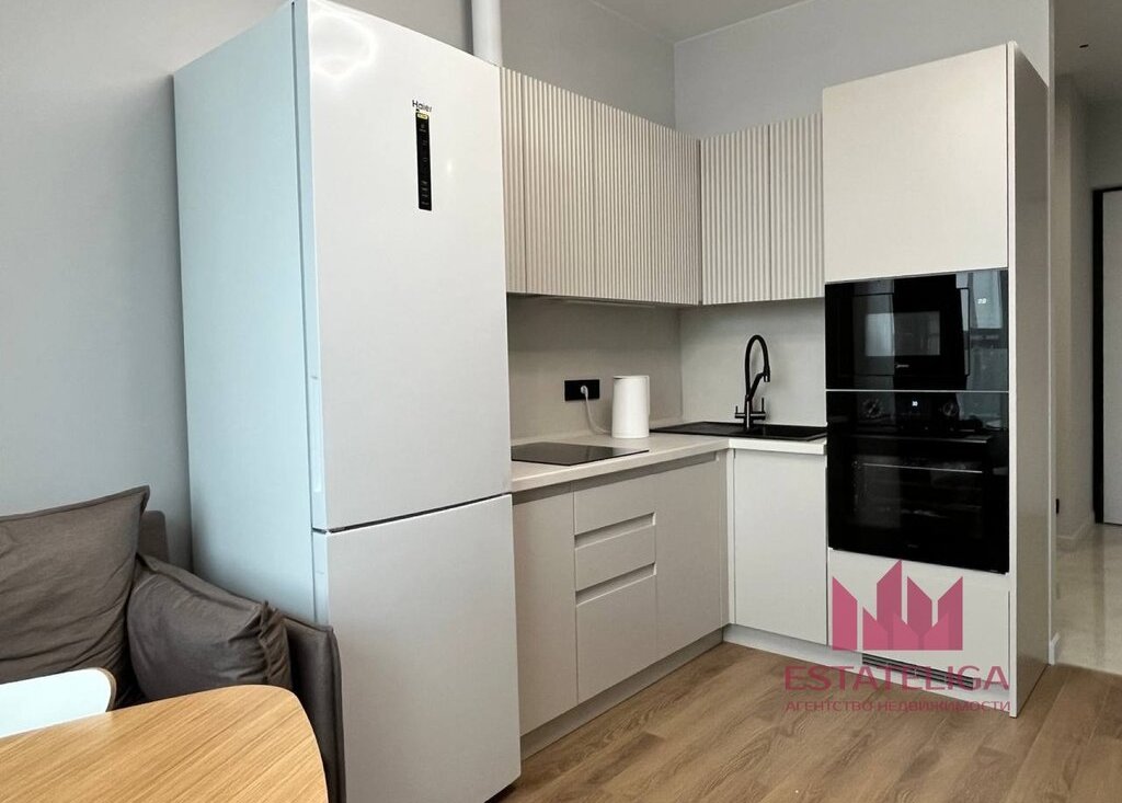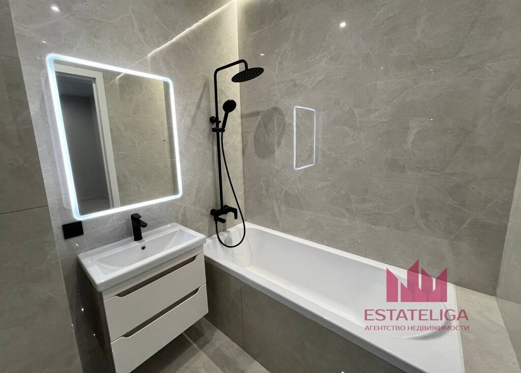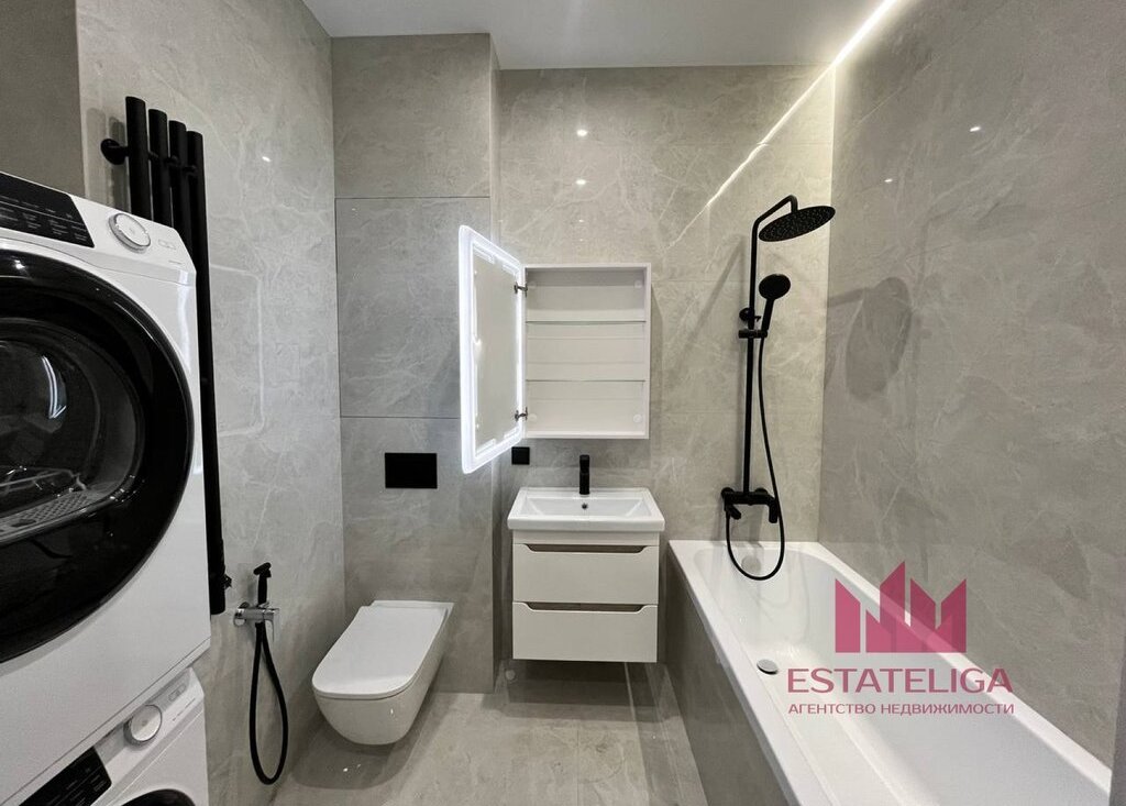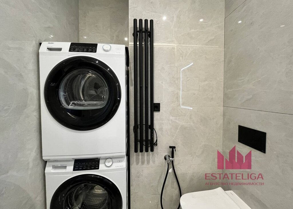 Внутреннее оснащение продумано до мелочей для комфортной жизни. Кухня площадью 8 квадратных метров оборудована полным набором техники: холодильник, варочная панель, вытяжка, кондиционер и посудомоечная машина, а в ванной комнате предусмотрены стиральная и сушильная машины. В комнате также установлен телевизор. Наличие ванны, а не душевой кабины, — редкое преимущество для квартир такого формата. В стоимость аренды уже включены коммунальные платежи, счетчики оплачиваются отдельно по факту расхода. Интернет проведен, что позволяет работать из дома без дополнительных хлопот.