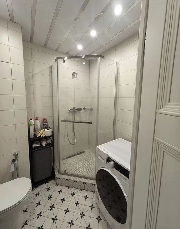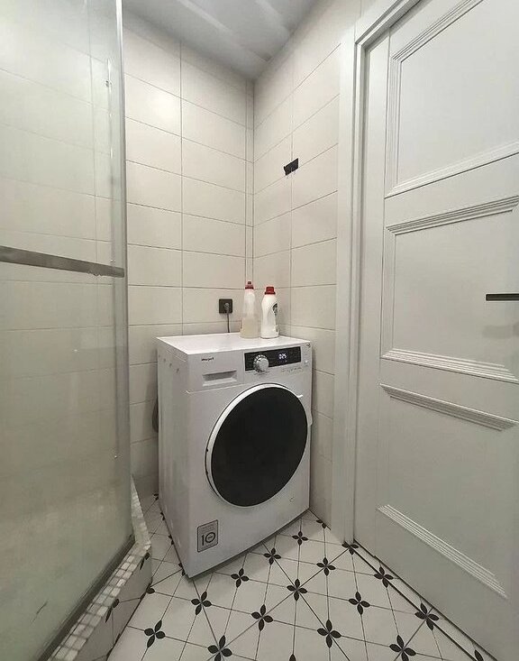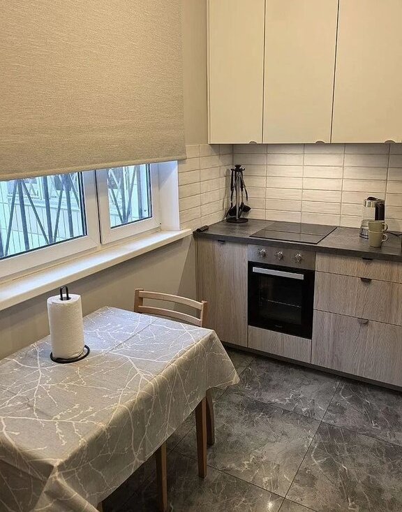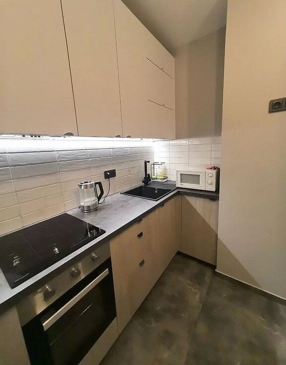 Кухня оснащена современной техникой: есть холодильник, микроволновая печь и электрическая индукционная плита, духовой шкаф. Также имеется обеденный стол и стулья. Ванная комната совмещенная, душевая кабина с новой сантехникой и стиральной машиной. Пылесос и утюг.