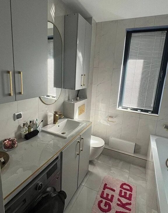 Ванная комната совмещённая, оформлена в светлых тонах и оснащена современной сантехникой. В прихожей предусмотрены вместительные шкафы для хранения вещей.