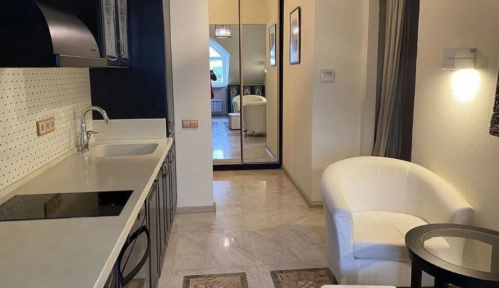 В квартире выполнен стильный дизайнерский ремонт, который создаёт атмосферу уюта и современности. Комната и кухня оснащены необходимой мебелью, а также современной техникой: кондиционером, холодильником, посудомоечной и стиральной машинами. Санузел совмещённый и оборудован душевой кабиной. Окна выходят как во двор, так и на улицу, поэтому в квартире всегда светло и приятно.