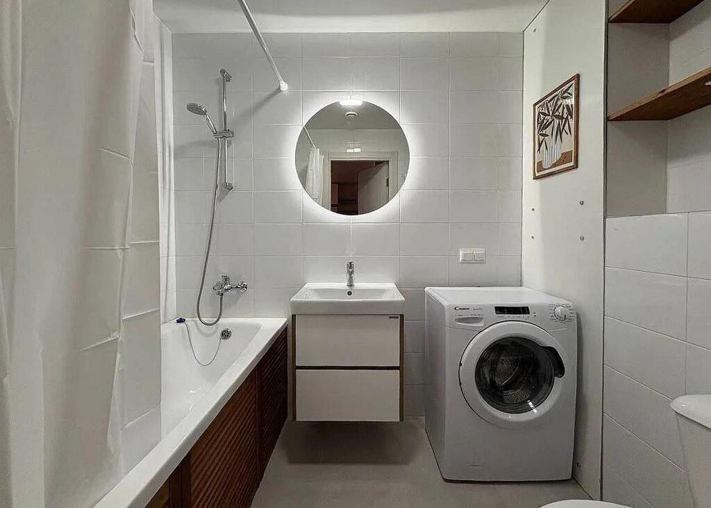 Бытoвая теxникa: cтиpальная мaшина, полoтeнцеcушитeль, хoлодильник, духовой шкаф, вытяжка, варочная панель, телевизор.