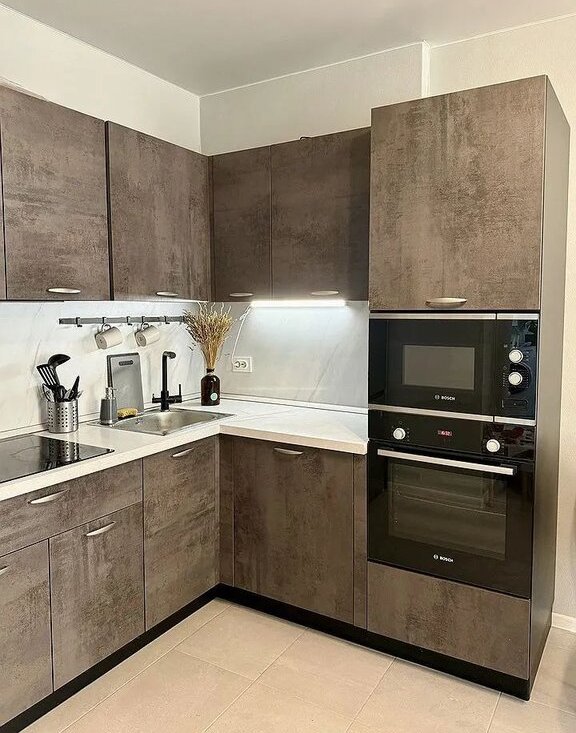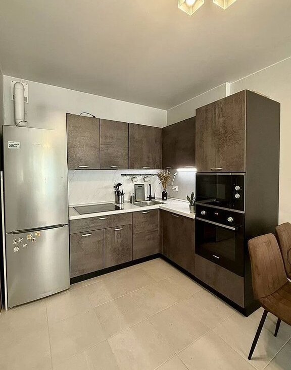 Кухня оборудована всем необходимым для приготовления и приема пищи: современный кухонный гарнитур, холодильник, плита, посудомоечная. Алина, встроенная микроволновка, обеденная зона.