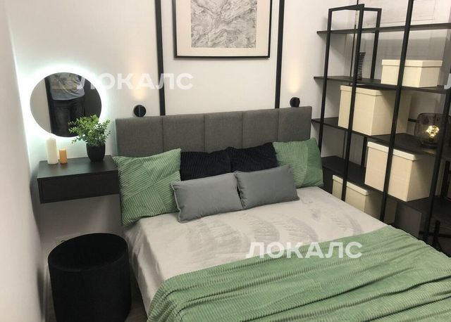 В спальной зоне расположена двуспальная кровать с подъемным механизмом, позволяющим использовать пространство под ней в качестве дополнительной зоны хранения, а также вместительный большой шкаф с полками и рейлингами, выделено место для туалетного столика.