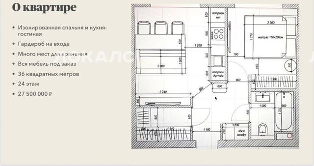 Планировка: Изолированная спальня и просторная гостиная с кухонной зоной.