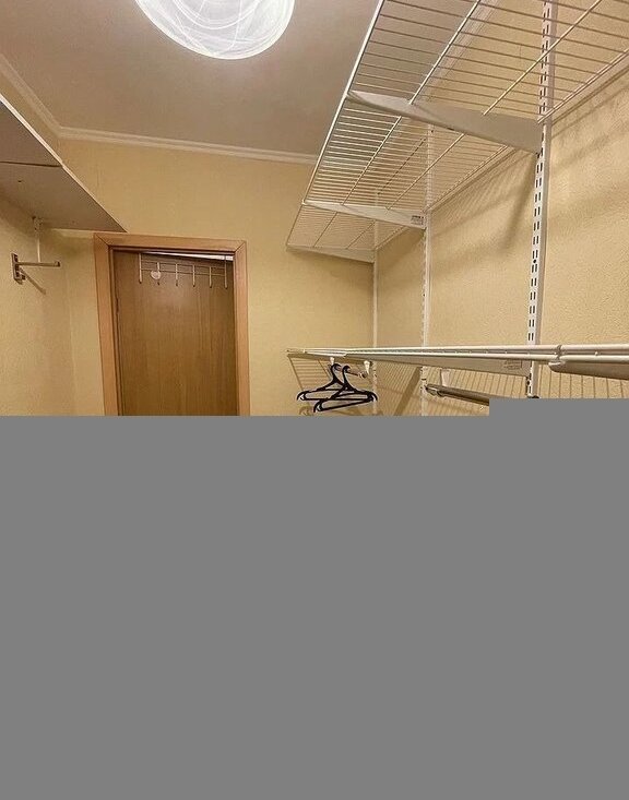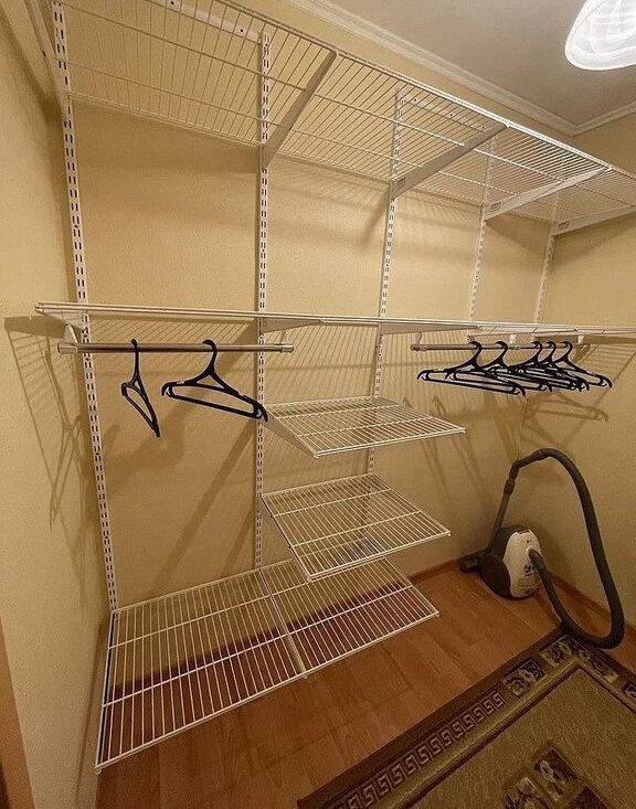 Вместительная гардеробная с гладильной доской и пылесосом.