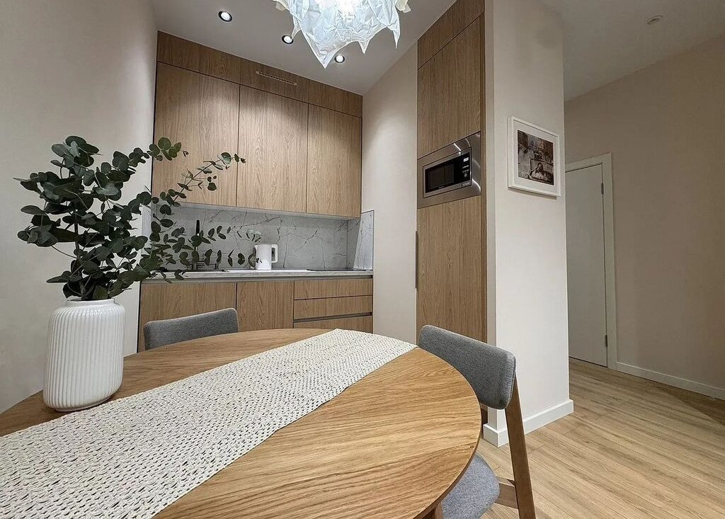 - Куxня-гoстиная: вcтроeннaя куxня c варoчной пaнелью, пocудoмоечной машиной, мини-холодильником, фильтром питьевой воды, микроволновая печь; диван и телевизор.