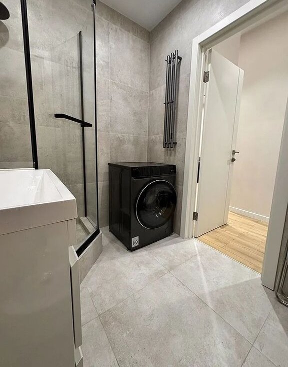 - Санузел: душевая кабина, биде, унитаз, стиральная машина с функцией сушки белья, встроенный шкаф.