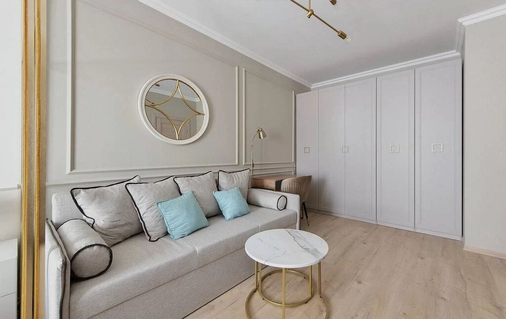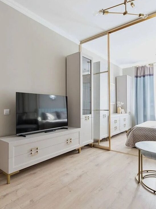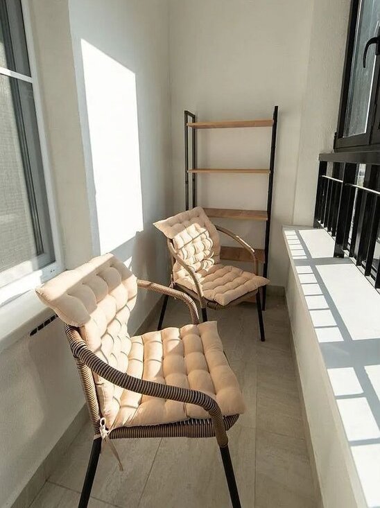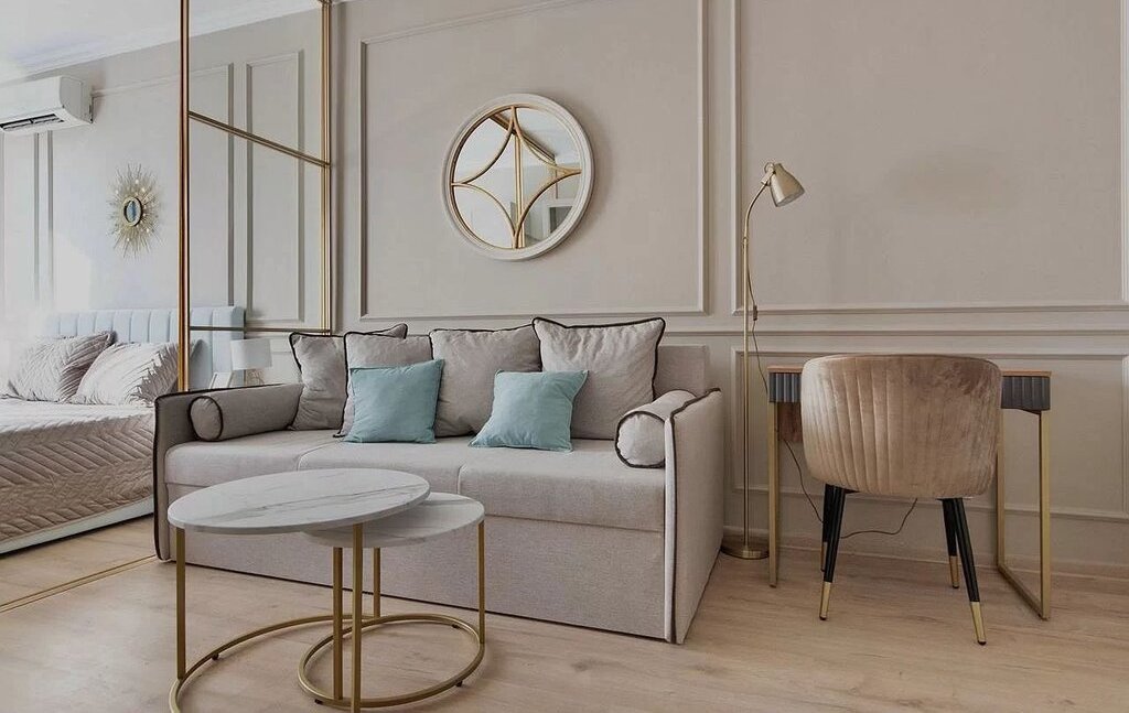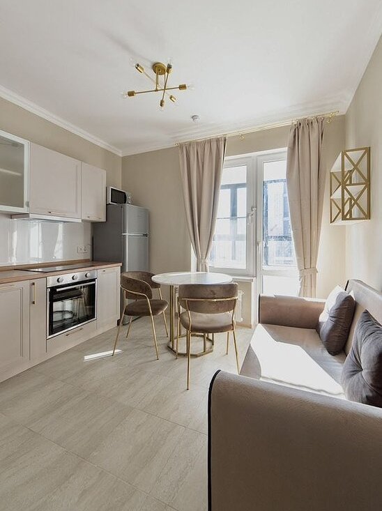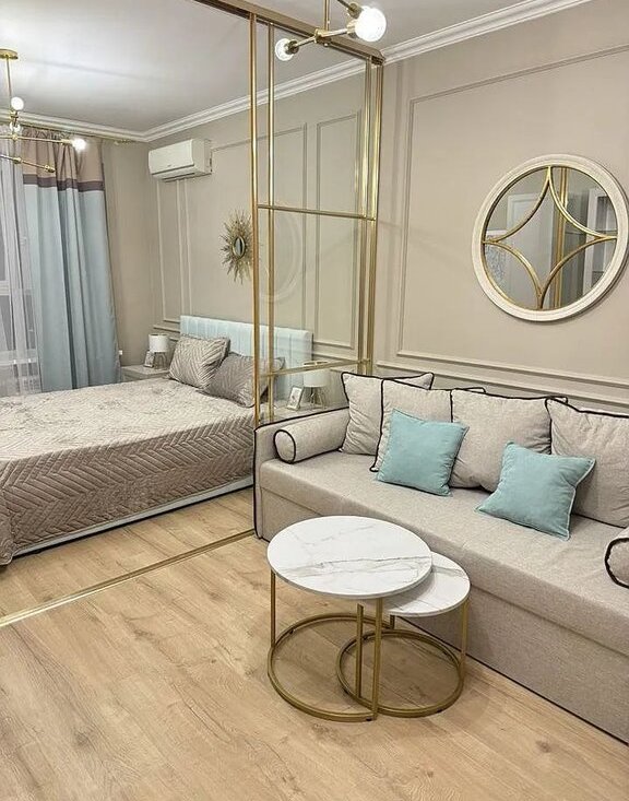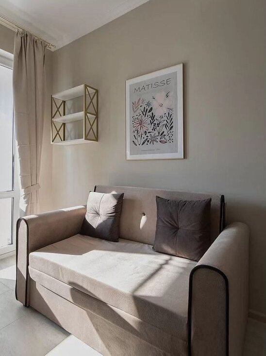 Разделенная на две зоны спальня -гостиная . В гостиной и на кухне диван раскладывается . Есть уютный просторный балкон с креслами для отдыха.