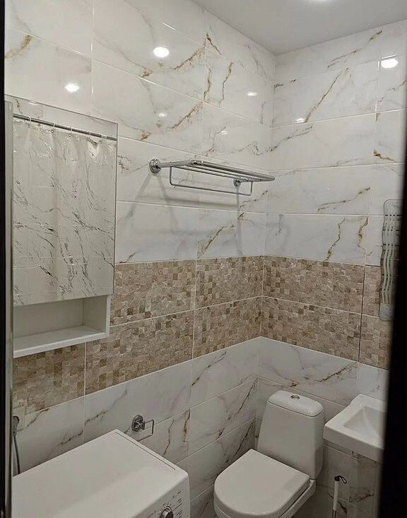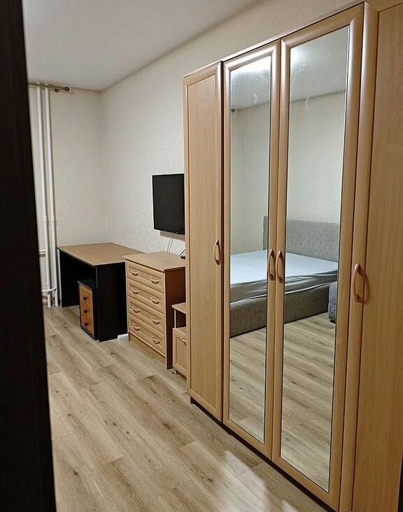 В комнате установлены шкафы и диван, а также имеется телевизор. Кухня оборудована современной техникой, включая холодильник и плиту. Санузел совмещенный, оформлен в светлых тонах и оснащен всем необходимым.