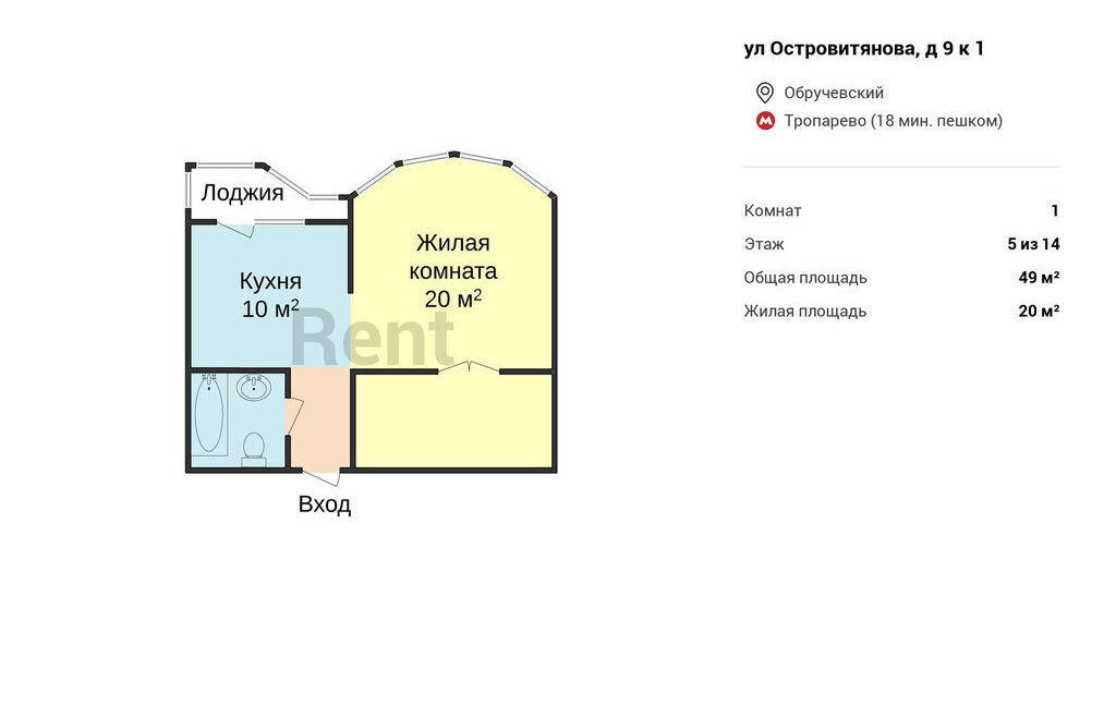1-комнатная квартира: Москва, улица Островитянова, 9к1 (49 м²)