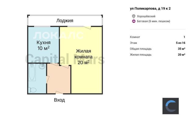 1-комнатная квартира: Москва, улица Поликарпова, 19к2 (35 м²)
