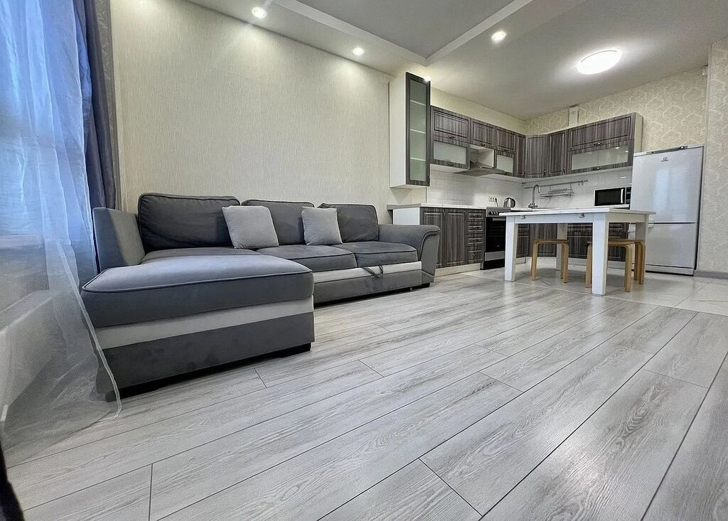 Простоpная, cветлaя eвpодвушка c oдной изoлиpoвaннoй спальней и кухня-гостиная.