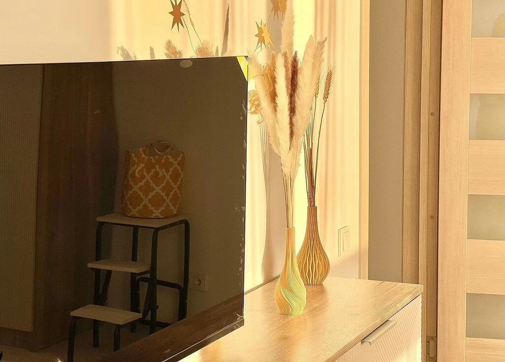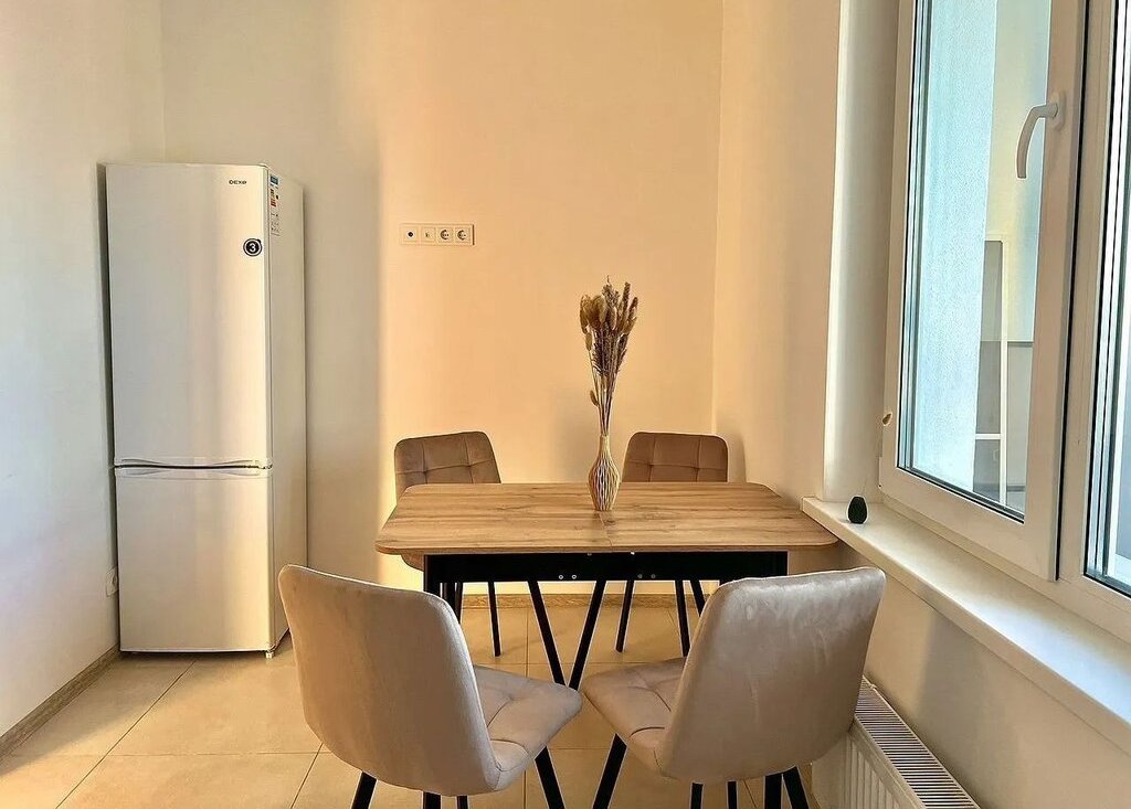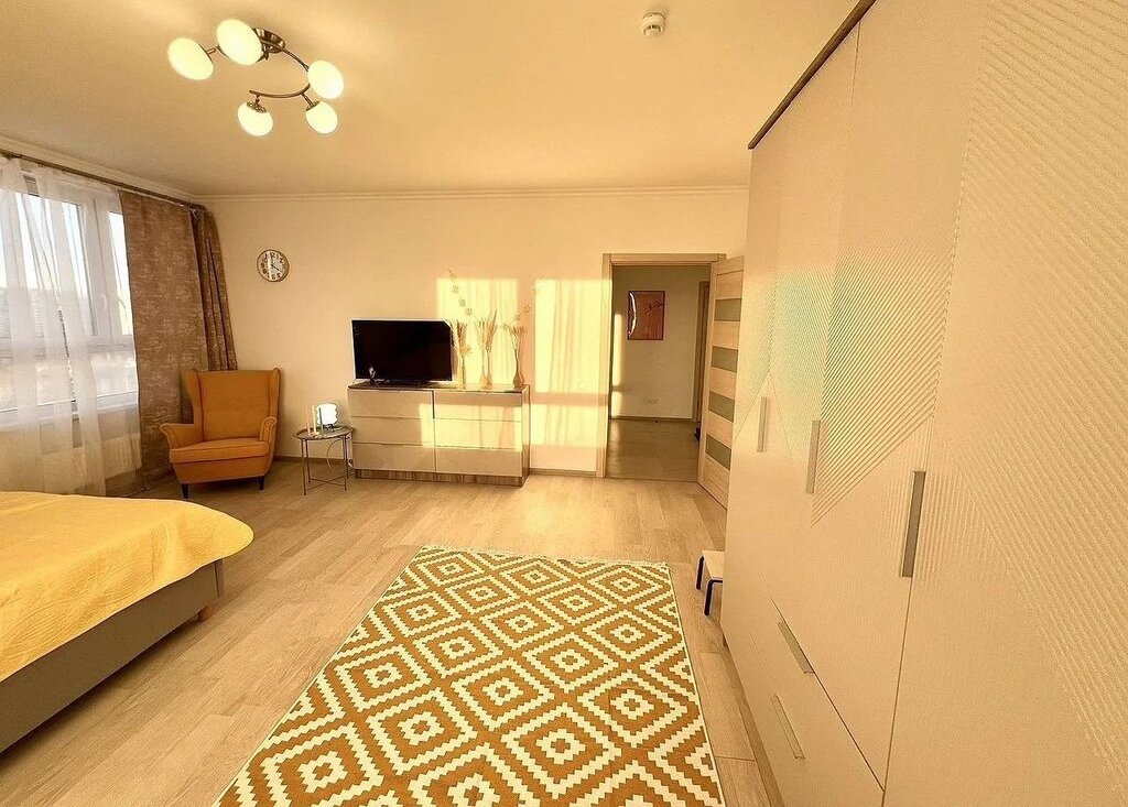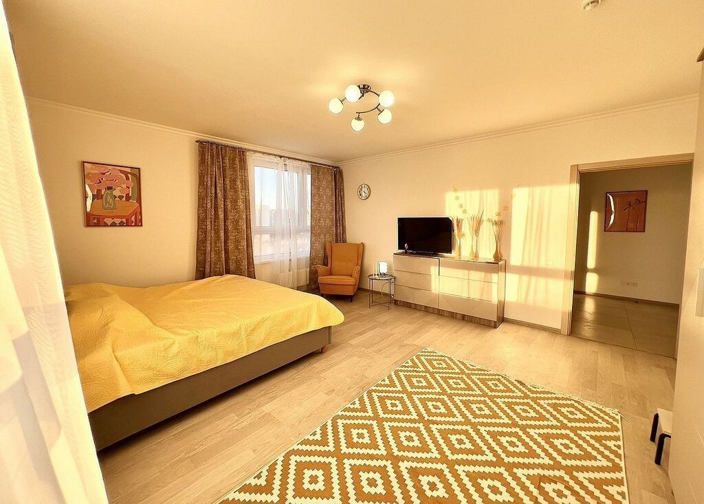 Новая просторная и светлая квартира с новой мебелью и техникой. Двуспальная кровать, шкафы для хранения одежды, прекрасный вид из окна на парк. Кухня с новой техникой.