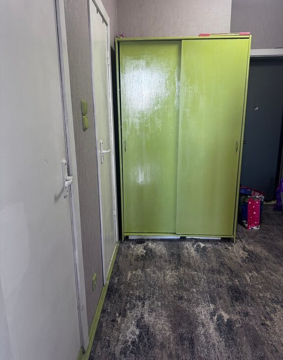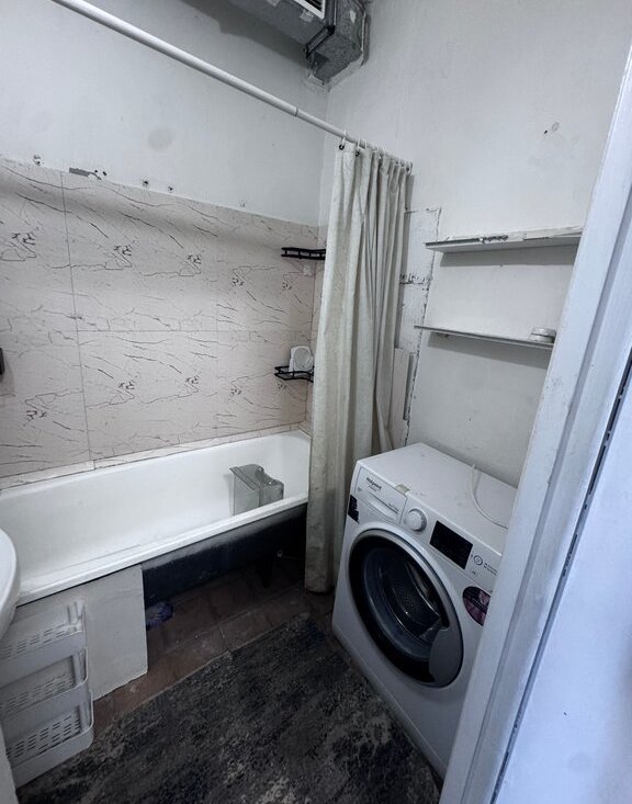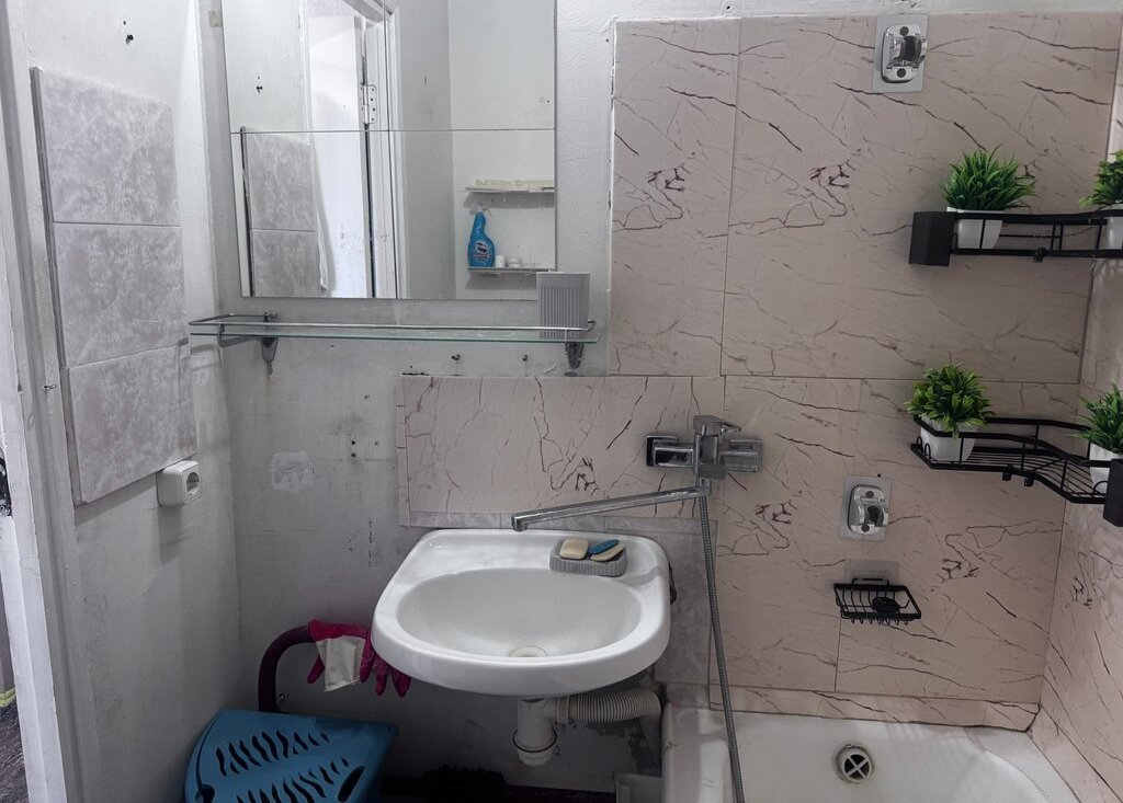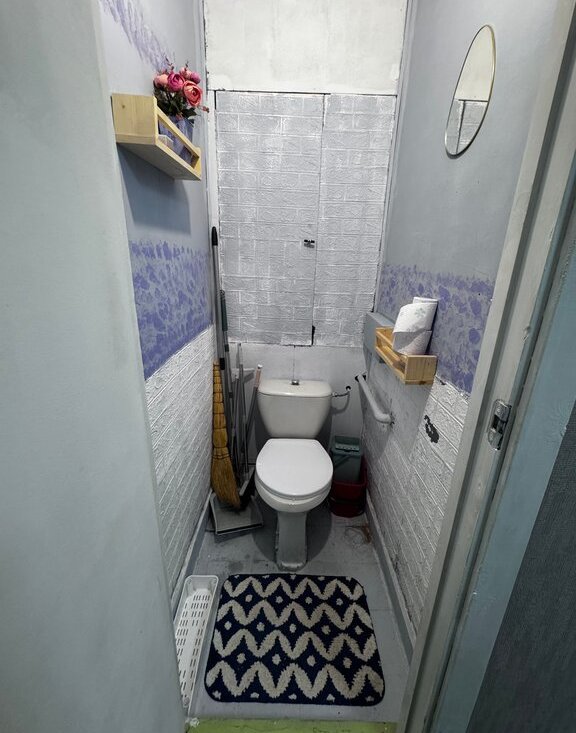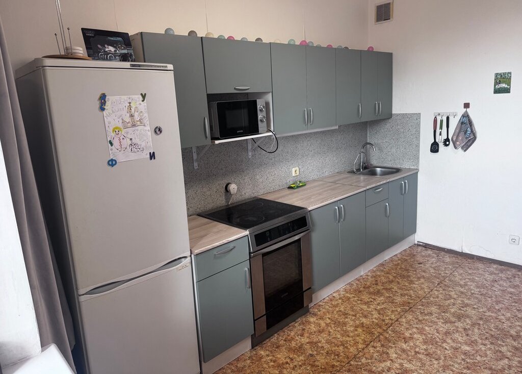 Кухня оборудована необходимой техникой: холодильник, плита и микроволновая печь. Из мебели — вместительные шкафы. Санузел раздельный, оформлен плиткой.