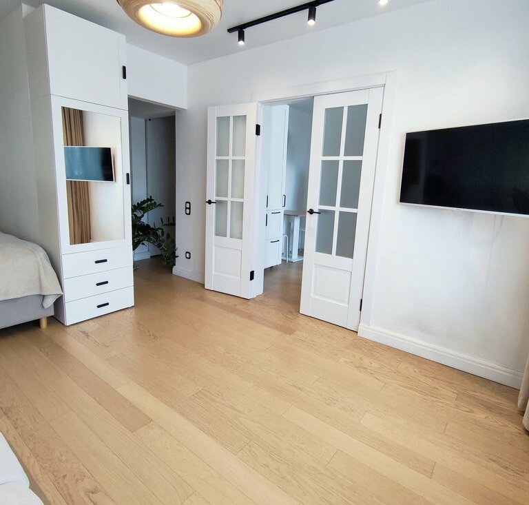 Кухонный гарнитур, встроенный холодильник, телевизор, ПОСУДОМОЕЧНАЯ МАШИНА, стиральная машина, двуспальная кровать с матрасом, раскладной диван в гостиной, большой шкаф для одежды.