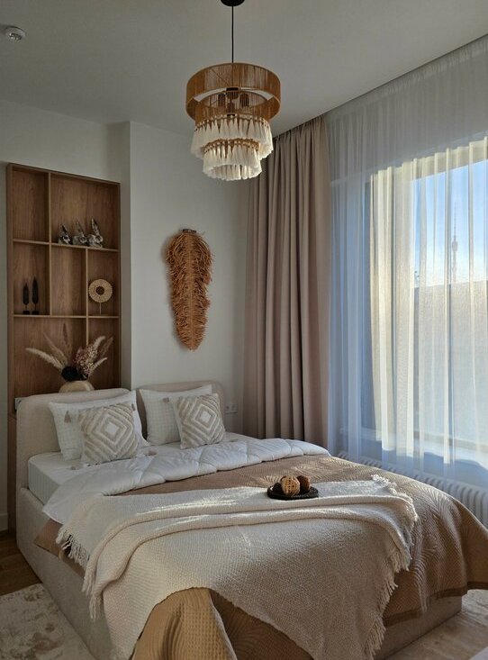 РИЕЛТОРОВ ПРОШУ НЕ БЕСПОКОИТЬ. Сдается уютная однокомнатная квартира с дизайнерским ремонтом в стиле Джапанди, что создаётособенную атмосферу без суеты, расположенная на 4 этаже современного 48-этажного дома. Общая площадь квартиры составляет 35 кв. м, из которых 12 кв. м отведено под жилую зону и 10 кв. м занимает просторная кухня. Высокие потолки в 3.1 метра создают ощущение простора и свободы. Окна выходят во двор, что гарантирует тишину и спокойствие.