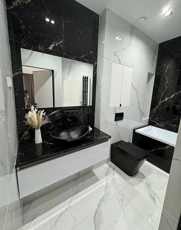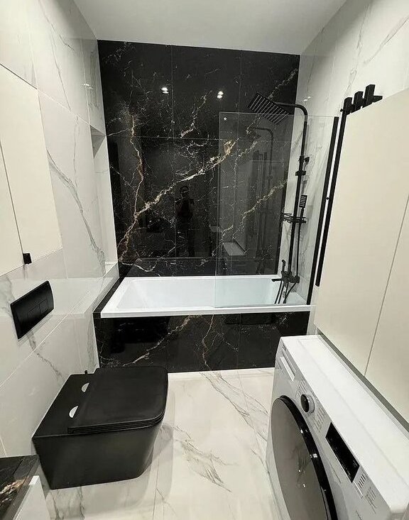 Санузел выполнен в широкоформатном керамограните и оснащен всей необходимой сантехникой, включая тропический душ. Установлена стиральная машина.