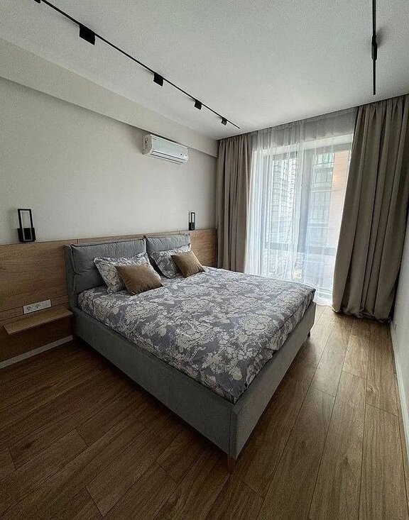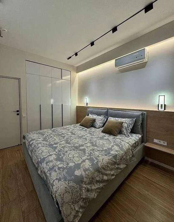 В квартире установлен дизайнерский свет на шинопроводе, декоративные подсветки в спальне.