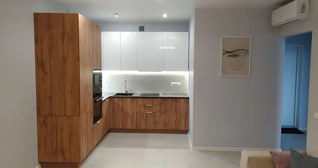 Большой, полноценный кухонный гарнитур. Имеется вся необходимая встроенная техника: индукционная варочная панель, духовой шкаф, микроволновая печь, холодильник, посудомоечная машина, вытяжка.