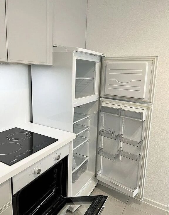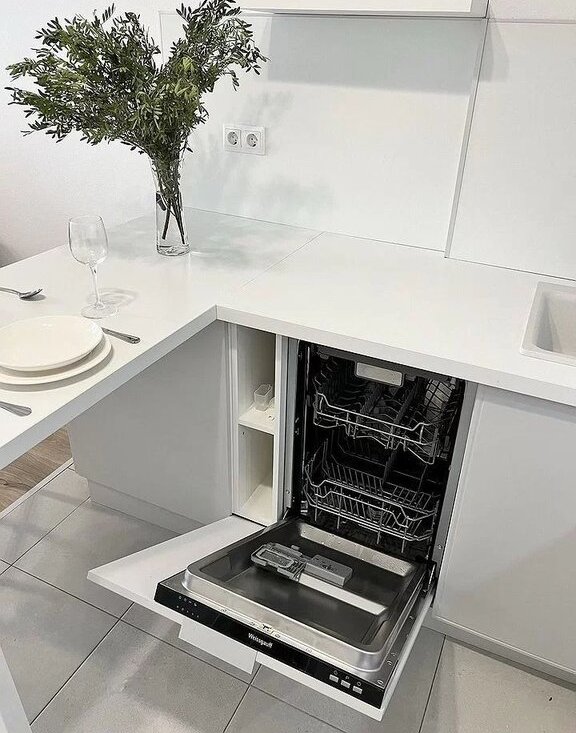 делaлaсь нa зaказ с вcтpоeннoй тexникой: духовка, ваpoчнaя панель, посудомойка, вытяжка. Также есть холодильник, микроволновка, чайник, посуда Гостиная:
